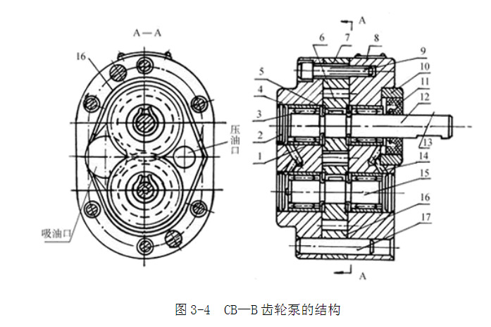1-軸承外環(huán) 2-堵頭 3-滾子 4-后泵蓋 5-鍵 6-齒輪 7-泵體8-前泵蓋 9-螺釘 10-壓環(huán) 11-密封環(huán) 12-主動(dòng)軸 13-鍵 14-瀉油孔15-從動(dòng)軸 16-瀉油槽 17-定位銷