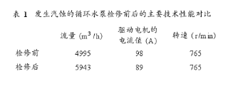 從循環(huán)水泵在大修中對葉輪或泵殼汽蝕部位修補后的情況來看,泵的出口流量總體上比檢修前均有所提高,接近離心泵的設(shè)計值,其驅(qū)動電機的電流值也出現(xiàn)了下降(見表1),給工藝操作帶來了便利,循環(huán)水系統(tǒng)操作和控制更加穩(wěn)定。