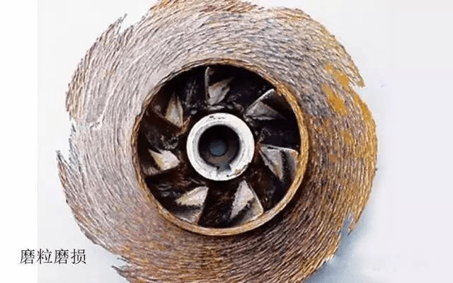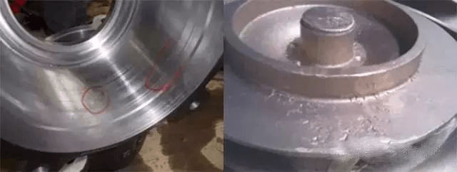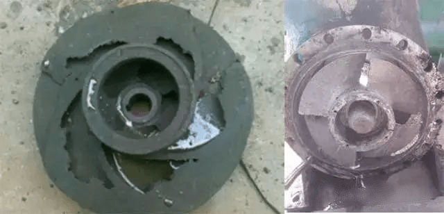 • 故障表現(xiàn):圖示是由灰鑄鐵材料鑄造的流程泵葉輪在5年時(shí)間內(nèi)被含有少量水泥泡沫的水磨損的情況,磨蝕問題更多的是設(shè)計(jì)方選材不當(dāng)或泵型選擇不當(dāng)造成的,或者是工藝介質(zhì)被污染導(dǎo)致的。