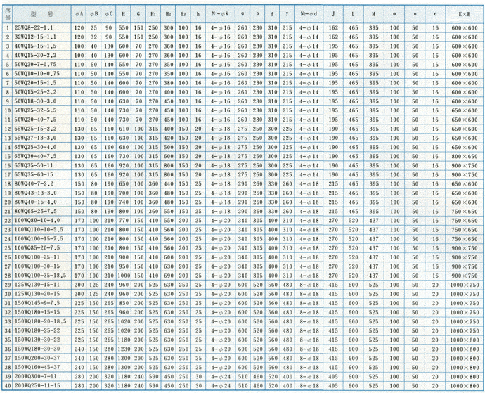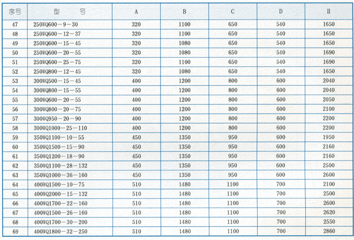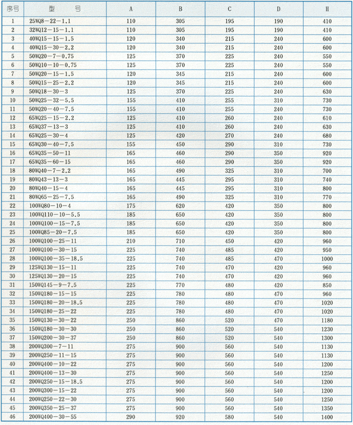 WQ型無堵塞潛水排污泵外形安裝尺寸表: