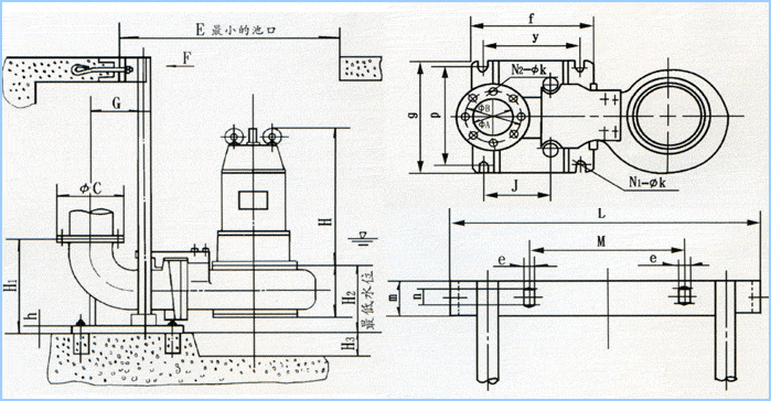 WQ型無堵塞潛水排污泵外形安裝尺寸圖: